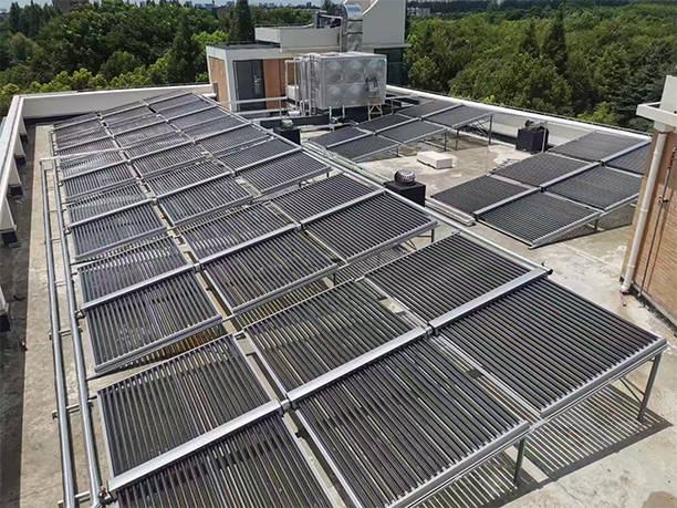 该项目主要配置:1200支集热管组成集热模块,15m3方形不锈钢储热水箱,热水供水使用了一套变频水泵,辅助热源为原有燃气热水炉。